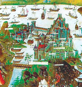 | 콘스탄티노플의 성곽 안팎을 묘사한 그림으로, 이 도시는 당시 세계에서 가장 번성했던 곳이다. |