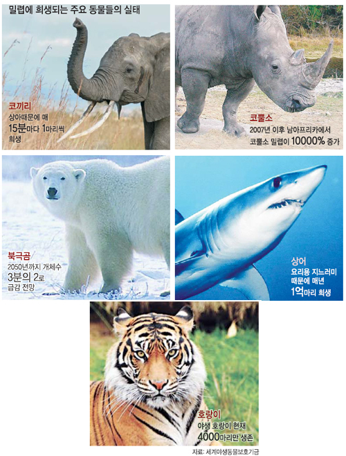 반면 밀렵은 단위나 규모가 다르다. 세계야생동물보호기금(IFAW)에 따르면 전 세계 동물 밀렵·밀수 규모는 연간 190억달러(약 22조3000억원)에 달한다. 전 세계 상아의 밀거래 규모만 매년 최소 70억달러로 추산된다. 특히 2010년에서 2014년 사이에 상아의 가격이 1kg에 2100달러까지 치솟으며 수요가 폭증했다. 코뿔소의 뿔은 1kg당 최고 7만5000달러에 매매되는데, 이는 같은 무게의 금보다도 비싼 값이다. 여기에 호랑이와 표범의 뼈, 발, 성기 등도 인기상품으로 유통된다.