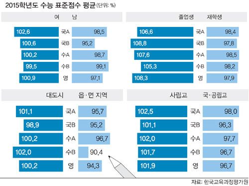 대도시와 읍·면지역 간의 격차도 컸다. 표준점수 평균 차이는 국어A 5.4점, 국어B 3.7점 수학A 3.5점, 수학B 11.6점, 영어 5.9점으로 대도시가 모든 영역에서 높았다.
