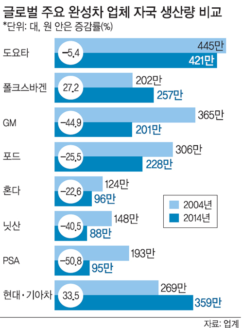현대·기아차의 2004년 대비 2014년 자국 생산량 증가율은 33.5%로 주요 업체 중에서 가장 높다. 현대·기아차를 포함한 8개 업체 평균은 -15.0%로 10년 새 자국 생산율이 뒷걸음질쳤다. 현대·기아차 다음으로 자국 생산량을 많이 늘린 기업은 폴크스바겐으로 2004년 202만대였던 독일 생산량을 2014년 257만대로 55만대(27.7%) 가량 늘렸다. 현대·기아차와 폴크스바겐을 제외한 나머지 업체들의 자국 생산량은 지난 10년 사이 모두 줄었다. 도요타는 2004년 다이하쓰와 히노를 포함해 445만대를 일본에서 생산했지만, 지난해에는 이보다 5.4% 감소한 421만대를 자국에서 생산했다. 혼다와 닛산의 일본 내 생산량도 10년 동안 각각 28만대(22.6%), 60만대(40.5%) 줄었다.