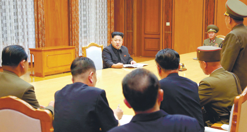 | 김정은 북한 국방위원회 제1위원장이 20일 밤 평양 노동당 청사에서 긴급 소집한 노동당 중앙군사위원회 비상확대회의를 주재했다고 21일 조선중앙통신이 보도했다. 김 제1위원장은 회의에서 21일 오후 5시(남한시간으로 오후 5시30분)부터 전선지대에 준전시상태를 선포하고 군 전선대연합부대들이 완전무장 상태에 돌입하도록 명령했다. 연합뉴스 |