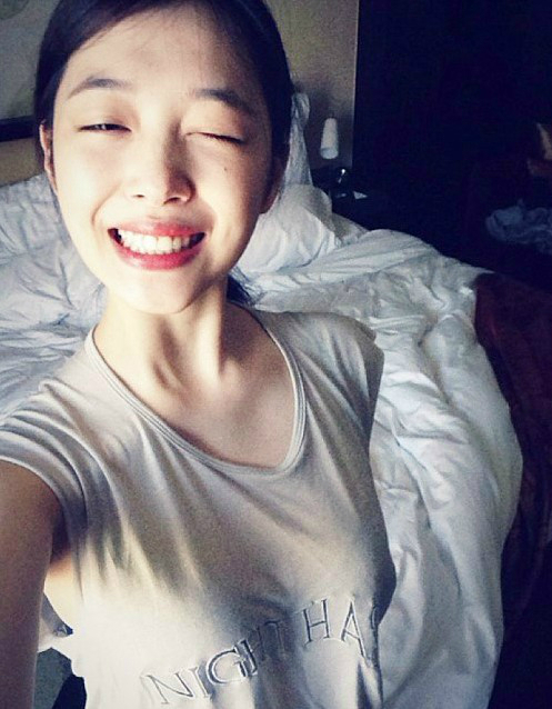 공개된 사진에서 설리는 침대 앞에서 윙크를 한 채 밝은 표정을 짓고 있다.