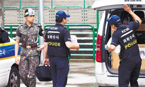 | 25일 오후 서울 은평구 구파발 군·경합동검문소에서 경찰관의 총기 오발 사고로 의경 1명이 사망한 현장에 도착한 경찰 과학수사대원들이 차량에서 수사 장비를 챙기고 있다. 연합뉴스 |