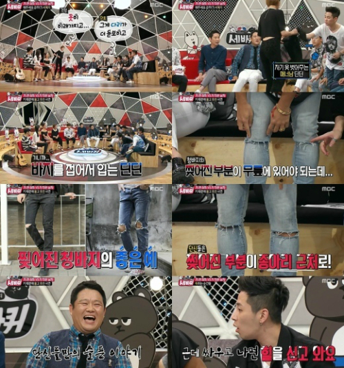 딘딘은 또 “찢어진 청바지를 사면 청바지 찢어진 부분이 종아리에 온다”며 손수 바지를 내려 시범을 보여 스튜디오를 웃음바다로 만들었다.