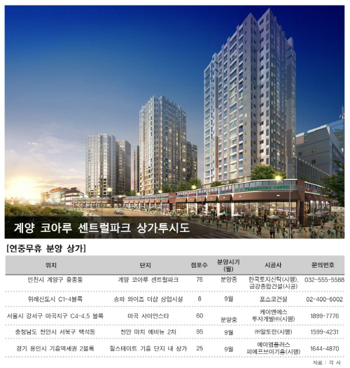 인천 계양구 용종동 일대에서 한국토지신탁이 시행하고 금강종합건설이 시공해 분양 중인 ‘계양 코아루 센트럴파크’는 유럽풍 스트리트형 상가로 꾸며진다. 지하 1층~지상 1층, 총 76개 점포로 구성돼있다. 주상복합 724가구 단지 내 독점수요와 3만4000여가구의 풍부한 배후수요 및 마트, 방송통신시설(예정)과 연계된 유동인구까지 흡수 가능해 높은 집객력을 통한 안정적인 수익이 가능할 것으로 기대된다. 또한 인천지하철 1호선 임학역 역세권에 위치해 상업시설과 역을 이용하는 유동인구를 자연스럽게 연결시켜줄 것으로 보여 상가의 가치가 극대화될 것으로 보인다.