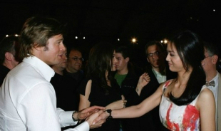 사진 속 브래드 피트는 탕웨이의 손을 두 손으로 움켜 잡고 있고, 탕웨이는 한 손으로 그에게 악수를 청하고 있다.