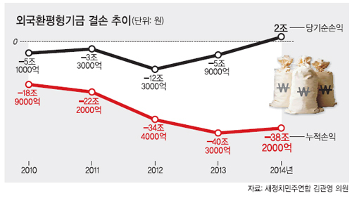 눈덩이처럼 불어나던 외평기금 누적손실은 다행히 지난해 한풀 꺾였다. 원·달러 환율 상승으로 2조원이 넘는 운용 수익을 기록했다. 이 덕분에 2013년 말 기준으로 40조원을 돌파했던 누적손실은 지난해 말 38조원으로 내려앉았다. 하지만 여전히 외평기금의 누적손실은 위험수위다. 2010년과 비교하면 20조원가량 늘었다.