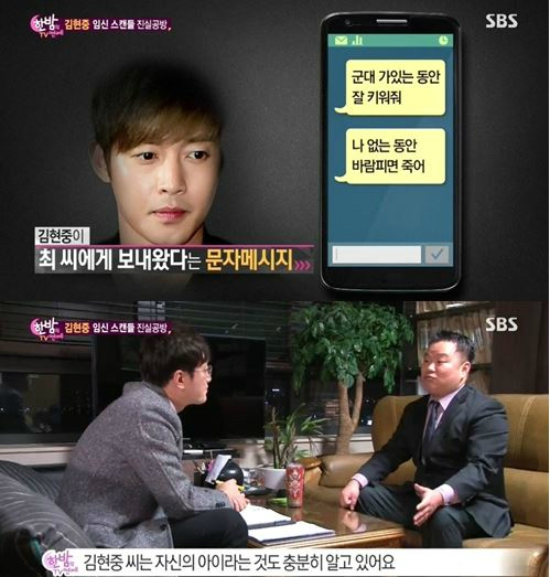지난 2월 방송된 SBS ‘한밤의 TV연예’에서는 김현중과 전 여친 A 씨와의 진실공방에 대한 내용을 다루며 김현중과 A씨가 주고받은 문자 메세지를 공개했다.