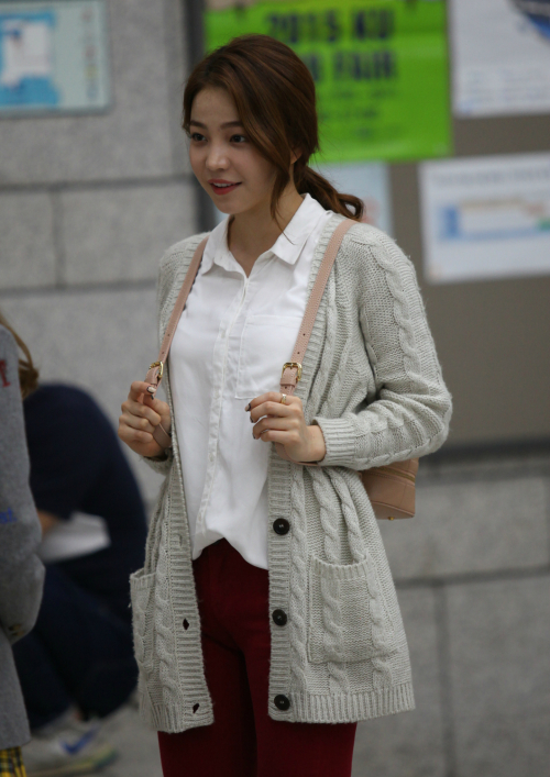 사진 속 지하윤은 강렬한 레드 팬츠에 흰 셔츠, 부드러운 베이지색 가디건을 매치해 통통튀면서도 과하지 않은 캠퍼스룩을 선보였다.