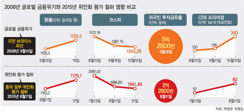 코스피는 리먼 파산 한 달 전인 2008년 8월15일 1572.19에서 파산 당일 1387.75까지 곤두박질치더니 한 달 후인 10월15일 1340.28까지 낮아졌다. 이번 위안화 절하 한 달 전인 2061.52로 2000선을 넘었던 코스피는 절하 당일 1986.65로, 지난달 말에는 1941.49로 떨어졌다. 외국인 투자금 역시 리먼 파산 당일에는 5억2800만달러가 빠져나갔고 위안화 절하 당일에는 2억2800만달러가 유출돼 비슷한 양상을 나타냈다.