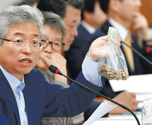 | “이것이 빼돌린 총기탄피” 새누리당 이철우 의원이 14일 서울 서대문구 경찰청에서 열린 국회 안전행정위원회의 경찰청 국정감사에서 경찰이 빼돌린 총기 탄피들을 들어보이며 경찰의 부실한 실탄관리 실태를 지적하고 있다. 연합뉴스 |