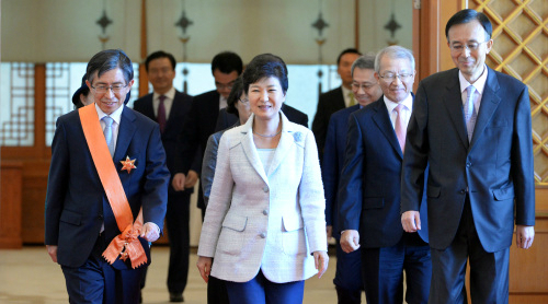 | 박근혜 대통령은 17일 청와대에서 퇴임하는 민일영 전 대법관 서훈 및 이기택 신임대법관 임명장 수여식후 환담장으로 이동하고있다. 청와대사진기자단 |
