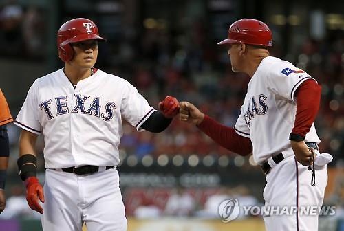 | 추신수가 17일(현지시간) 휴스턴과의 경기에서 1회 좌전 안타를 친 뒤 1루에서 주루 코치와 주먹을 부딪히고 있다. 추신수는 이틀 연속 멀티 히트를 쳤다. |