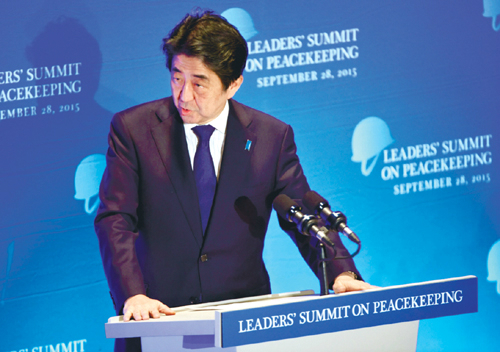 | 28일(현지시간) 아베 신조 일본 총리가 미국 뉴욕 유엔 본부에서 열린 ‘평화유지를 위한 리더 정상회의’에 참석해 연설하고 있다. 뉴욕=연합뉴스 |
