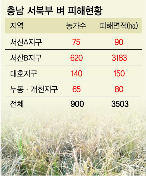 충남도에 따르면 이날 현재 집계된 피해만 900농가 3503㏊에 달하고 있다. 천수만 A·B지구 농경지의 경우 지난달 중순부터 벼 전체가 말라죽는 잎마름 현상이 나타난 뒤 695농가의 3273㏊로 급속히 확산되고 있다. 잎마름 현상이 악화되면 벼가 채 여물지 못해 쭉정이만 남게 되면서 수확이 어렵게 된다. 특히 이삭이 팰 시기에 가뭄의 직격탄을 맞은 조생종 벼의 피해가 심하다.