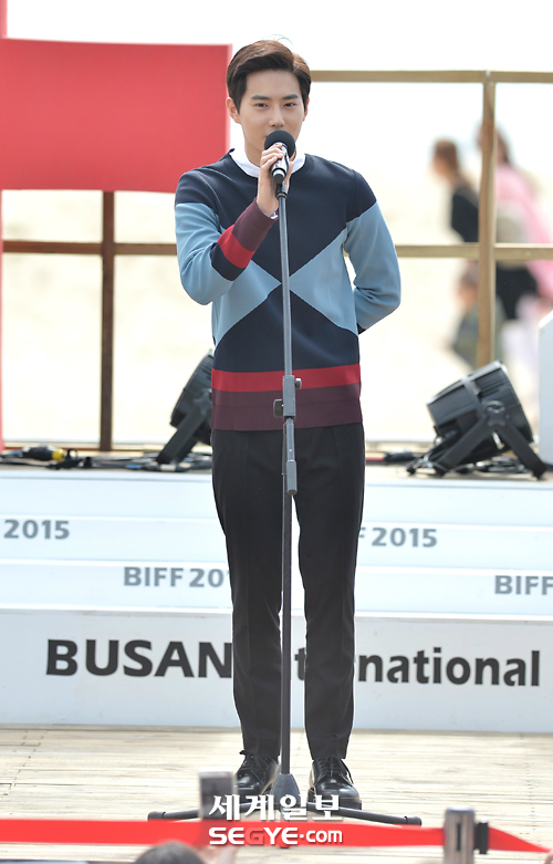 가수 엑소 수호가 4일 오후 부산 해운대 비프빌리지에서 진행된 영화 '글로리데이' 야외무대인사에 참석해 인사말을 하고 있다.