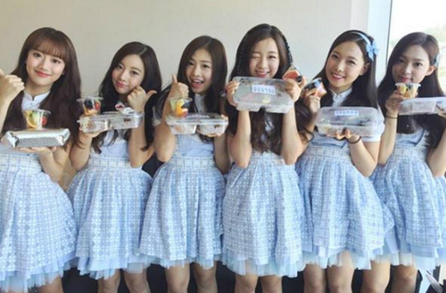 공개된 사진 속 에이프릴 멤버들은 하늘색 무대 의상을 입고 도시락을 든 채 포즈를 취하고 있다.