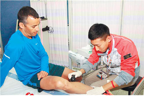 | 2015 경북문경 세계군인체육대회 영천 선수촌에서 의료진이 부상당한 선수를 정성껏 치료하고 있다. 2015 경북문경 세계군인체육대회 조직위원회 제공 |