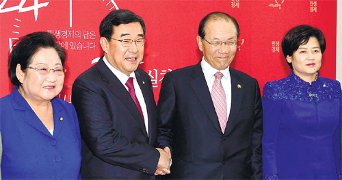 | 황우여 사회부총리 겸 교육부 장관(오른쪽 두 번째)과 새누리당 김정훈 정책위의장(왼쪽 두 번째)이 11일 국회에서 역사교과서 국정화 관련 논의를 위한 당정 협의를 갖기 전 악수하고 있다. 왼쪽과 오른쪽은 당 역사교과서개선특위 위원장과 간사인 김을동 최고위원과 강은희 의원. 이재문 기자 |
