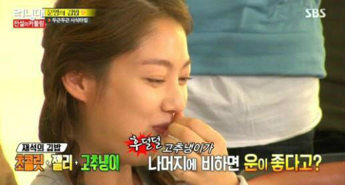 런닝맨에 출연한 공승연이 유재석 김밥을 먹고 충격을 받았다.