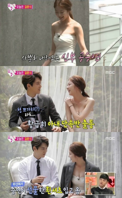 이날 방송에서 공승연은 자신의 가상 부부인 그룹 씨엔블루 멤버 이종현과 결혼식을 올렸다. 공승연의 과감한 드레스 자태에 이종현은 “위에 입을 것 없냐”면서 결국 자신의 재킷을 걸쳐줬다.