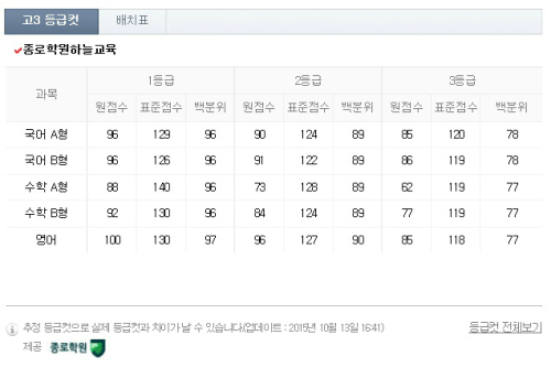 | 10월 모의고사 등급컷 (사진= 종로학원 제공, 네이버 캡처) |