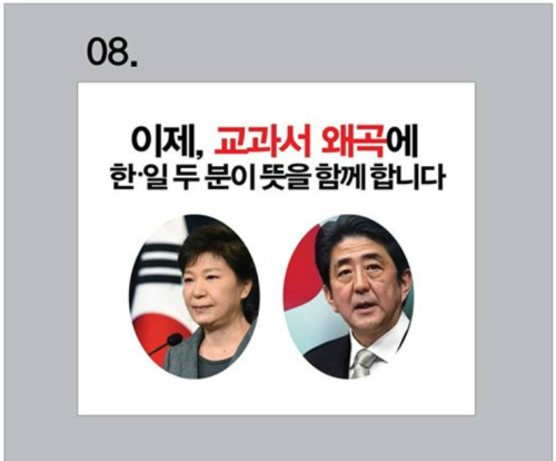 손 위원장 홍보물 시안에는 "이제, 교과서 왜곡에 한일 두분이 뜻을 함께 합니다"라는 글과 함께 박 대통령과 아베 총리의 사진이 나란히 실렸다.