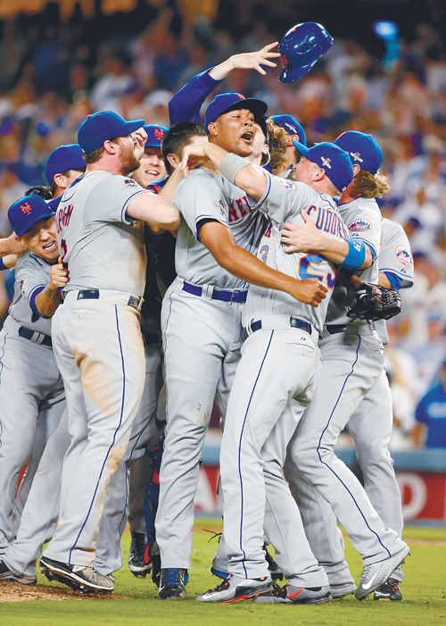 | 환호 뉴욕 메츠 선수들이 16일 미국 캘리포니아주 로스앤젤레스의 다저스타디움에서 열린 LA 다저스와의 내셔널리그 디비전시리즈 5차전에서 3-2로 승리해 내셔널리그 챔피언십시리즈 진출이 결정되자 서로 얼싸안고 환호하고 있다. 로스앤젤레스=AFP연합뉴스 |