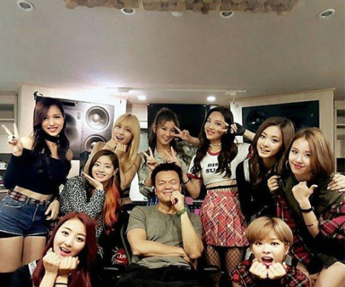 공개된 사진에서 트와이스 멤버들은 박진영과 함께 다정한 포즈를 취하고 있다.