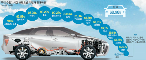 이번 디젤 게이트로 국내 수입차 시장의 70%를 장악한 독일 디젤차의 타격이 예상된다. 그렇다고 최근 1∼2년 새 디젤 라인업을 확대한 국내 완성차업체들이 마냥 웃을 수 없는 게 현실이다. 폴크스바겐처럼 ‘클린 디젤’을 전면에 내세운 것은 아니지만 디젤 엔진에 대한 소비자 신뢰가 훼손된 상황이라 국산 경유차도 비상이 걸렸다. 실제 지난해 현대차와 기아차의 디젤차 비율은 각각 32.6%와 36.0%였지만, 올해 1∼8월에는 그 비율이 37.4%와 45.9%로 껑충 뛰었다. 한국GM, 쌍용차, 르노삼성차 등도 최근 몇 년 새 디젤차 비율을 경쟁적으로 늘려온 만큼 이번 디젤 게이트로 타격을 입을 수도 있다는 지적이다. 특히 해외 수출 차량의 디젤차 비율도 함께 확대하는 상황에서 디젤차 내수와 수출이 ‘동반하락’할 수 있다는 우려도 나온다.