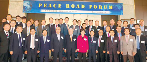 | 20일 서울 중구 소공로 더 플라자호텔에서 세계평화터널재단 주최로 열린 ‘제16회 피스로드포럼’에서 세계일보 김민하 회장(앞줄 왼쪽 다섯 번째)과 최연혜 코레일 사장(〃 일곱 번째) 등 참석자들이 기념촬영을 하고 있다. |