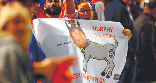 | “메츠 머피가 염소” 미국 프로야구 뉴욕 메츠의 팬이 22일 포스트시즌 6경기 연속 홈런포를 가동하며 맹활약하고 있는 메츠 2루수 대니얼 머피의 얼굴에 염소를 합성한 플래카드를 들고 응원하고 있다. 1945년 컵스가 쫓아낸 관중의 염소 이름이 ’머피‘로, 둘의 이름이 같은 데서 착안해 메츠팬들이 이 같은 사진으로 컵스를 조롱하는 응원을 하게 됐다. USA투데이스포츠연합뉴스 |
