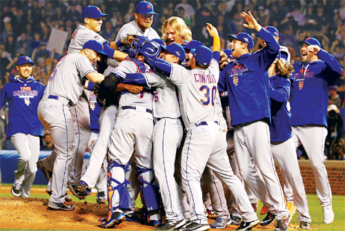 | “이렇게 좋을 수가” 미국 메이저리그 뉴욕 메츠 선수들이 22일 일리노이주 시카고의 리글리필드에서 열린 내셔널리그 챔피언십시리즈 4차전에서 승리해 월드시리즈 진출을 확정 지은 뒤 서로 얼싸안으며 기쁨을 만끽하고 있다. 시카고=UPI연합뉴스 |