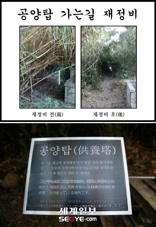 | 공양탑 주변에 안내판을 설치하려 했지만 '강제동원'이라는 단어 때문에 나가사키(長崎) 시가 허가를 미루고 있다. 특히 안내판 맨 아래에는 '이 안내판은 대한민국 네티즌들의 모금으로 제작되었습니다'라는 문구가 선명히 들어가 있다(사진=서경덕 교수 제공) |