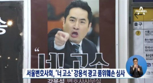 강용석 변호사는 지난 9월 서울 지하철 2호선 서초역에 본인이 한 방향을 향해 손가락을 가리키며 '너! 고소'라는 문구가 쓰여 있는 포스터를 내걸었다. 서울변회는 이 포스터가 변호사의 품위유지의무를 위반한다고 판단해 광고심사위원회에 회부했다.