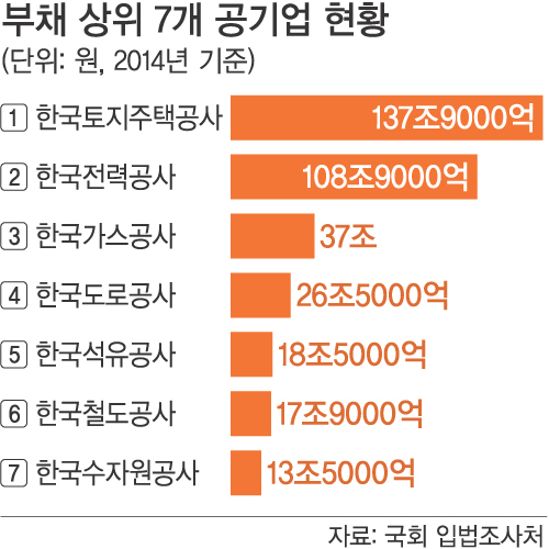 30일 국회입법조사처가 내놓은 ‘공공기관 부채 현황과 시사점’ 리포트에 따르면 전체 공공기관의 부채는 2010년 말 398조8000억원에서 지난해 말 520조5000억원으로 5년 사이 121조7000억원이나 늘었다. 특히 이 중에서 공기업 부채는 같은 기간 292조원에서 377조1000억원으로 85조1000억원 증가했다.