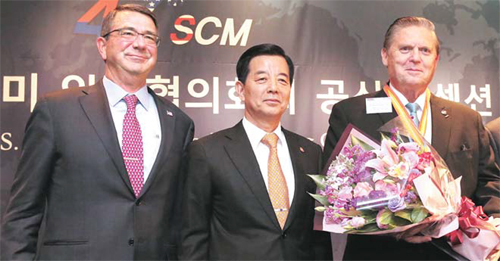 | 6·25전쟁 당시 미 8군사령관으로 참전했던 고 제임스 밴플리트 장군이 올해의 ‘백선엽 한·미동맹상`을 받았다. 1일 서울 하얏트호텔에서 열린 시상식에서는 그의 외손자인 조지프 매크리스천 주니어 밴플리트재단 이사장(오른쪽)이 대신 상을 받았다. 한민구 국방부 장관(가운데), 애슈턴 카터 미 국방장관(왼쪽)도 시상식에 참석했다. 연합뉴스 |