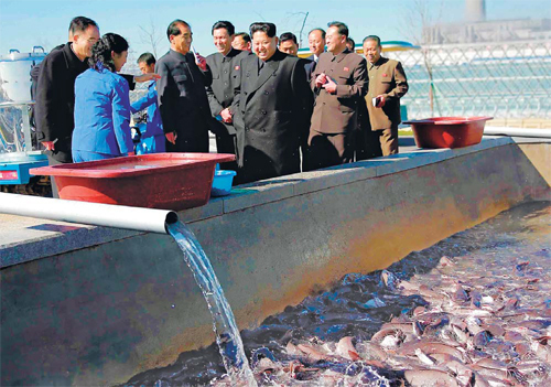 | 메기 양식공장 시찰 나선 김정은 김정은 북한 국방위원회 제1위원장(가운데)이 새로 지어진 평양의 메기 양식공장을 시찰하고 있다. 조선중앙통신은 지난달 31일 김 제1위원장이 메기공장을 현지지도했고, 박봉주 내각 총리, 오수용 노동당 비서, 조용원 당 조직지도부 부부장이 수행했다고 전했다. 연합뉴스 |