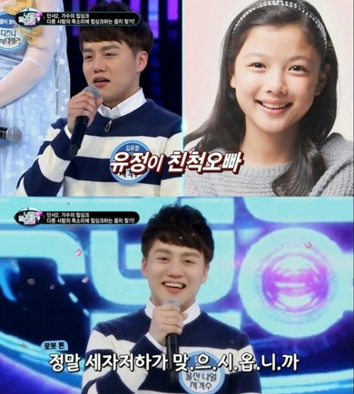 지난 4월 23일 방송된 tvN 예능프로그램 ‘너의 목소리가 보여’에는 도전자로 김유정의 친척오빠가 출연해 가창력을 과시했다.