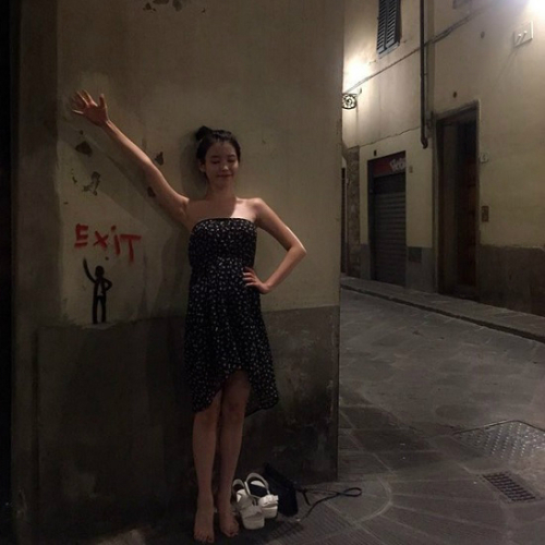 공개된 사진에서 아이유는 어깨 라인과 다리 라인이 고스란히 드러나는 톱 원피스를 입고 카메라를 향해 한 쪽 팔을 들어올린 포즈를 취하고 있다.