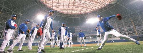 | 고척돔서 훈련하는 대표팀 야구 국가대항전 ‘프리미어 12’에 출전하는 한국 대표팀 선수들이 쿠바와의 평가전을 하루 앞둔 3일 서울 구로구 고척스카이돔에서 훈련하고 있다. ‘2015 서울 슈퍼시리즈’로 명명된 이번 평가전은 국내 최초의 돔구장인 고척스카이돔에서 열리는 첫 야구 경기로 4∼5일 진행된다. 연합뉴스 |