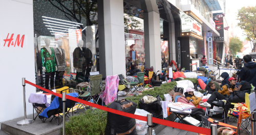 | 3일 서울 중구 명동에 있는 스웨덴 패션 브랜드 H&M 명동 매장 앞에서 수십명의 고객들이 캠핑 의자와 담요 등을 구비한 채 5일 오전 8시부터 명동점 등 4개 매장에서 판매되는 한정판 상품을 기다리고 있다. 이제원 기자 |