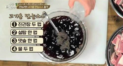 이어 공개된 고기용 만능소스 레시피는 간장 2컵, 물 2컵, 맛술 1컵, 설탕 1컵, 간마늘 반 컵, 다진 생강 1숟갈, 파 1컵을 그릇에 부어 잘 섞어주면 되며 참기름을 살짝 넣어주면 완성된다.