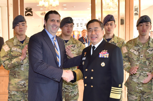 | 마크 리퍼트 주한 미국대사가 4일 오전 해군 특수전전단 창설 60주년 기념 세미나에 참석해 정호섭 해군참모총장과 반갑게 악수하고 있다. 사진=해군 |