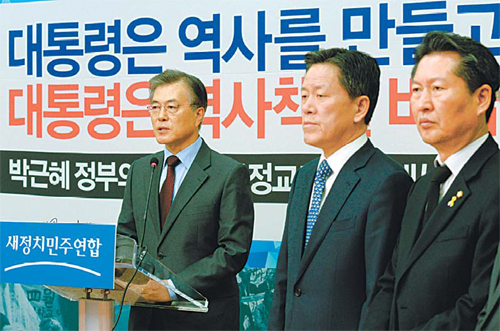 | 새정치민주연합 문재인 대표(왼쪽)가 4일 국회 당 대표실에서 ‘역사국정교과서 저지, 이제부터 시작’이라는 제목의 대국민 담화문을 발표하고 있다. 남정탁 기자 |