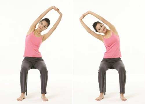 | 몸을 가뿐하게 하는 스트레칭 - 양손을 머리 위로 깍지 끼고 쭉 편 다음 한쪽 방향으로 천천히 내려준다. 옆구리 근육을 이완시켜서 허리와 등의 피로를 풀어준다. 15초 동안 2회 좌우로 반복한다. |