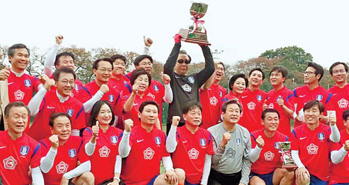 | 새누리당 김무성 대표(앞줄 오른쪽 세번째)를 비롯한 한·일 의원연맹과 국회의원축구연맹 소속 여야 의원이 7일 일본 요코하마 소재 게이오대 히요시캠퍼스에서 일본 축구외교추진의원연맹 소속 의원들과 친선 축구경기를 끝낸 뒤 우승 트로피를 들고 기뻐하고 있다. 요코하마=연합뉴스 |
