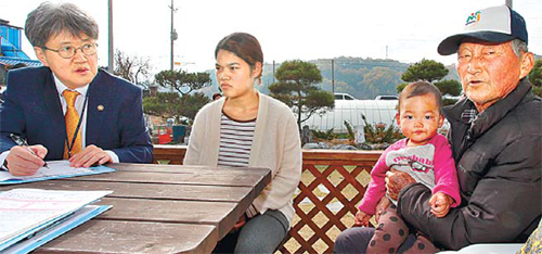 | 유경준 통계청장(왼쪽)이 지난 5일 충남 금산군 군북면 박정용(76·오른쪽)씨 가정을 찾아 인구주택총조사를 설명하면서 설문조사를 진행하고 있다. |