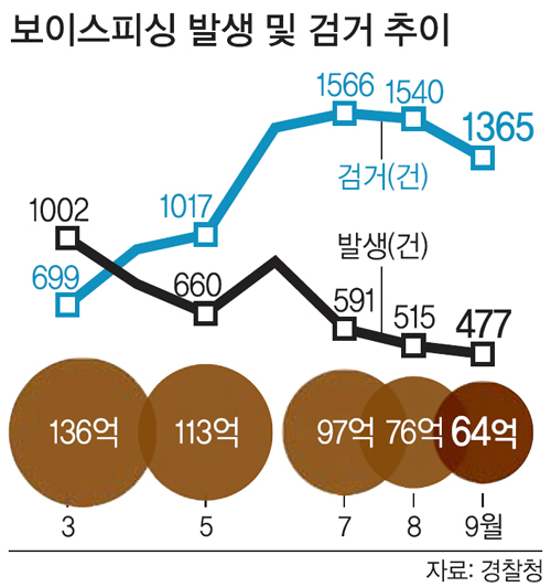 경찰은 지난 2월부터 각 지방청 지능범죄수사대에 보이스피싱 전담반을 설치하고 상·하반기 특별단속기간을 만드는 등 보이스피싱 근절에 총력을 기울였다. 그 결과 지난 3월 한 달간 1000건을 넘어섰던 보이스피싱 발생 건수가 6개월 만에 477건(9월)으로 절반 이상 감소한 반면 오히려 검거 건수는 699건(3월)에서 1365건(9월)으로 대폭 증가했다.