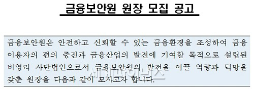 | 금융보안원 원장 모집 공고. 사진=금융보안원 홈페이지 캡처 |